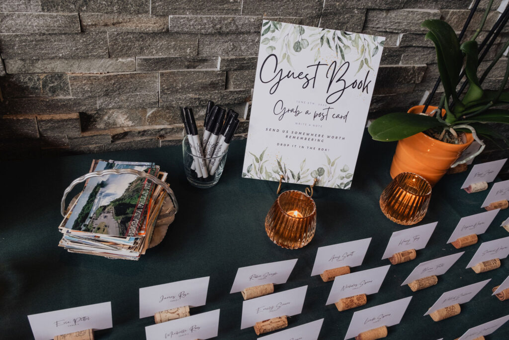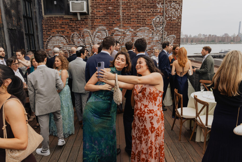 Guests transitioned into cocktail hour both inside and outside the venue. As the celebration unfolded, they sipped cocktails, mingled freely, and took in sweeping views of the New York skyline. All the while, the energy felt relaxed and celebratory. Adding to the experience, a travel-inspired guest book offered a thoughtful personal touch, as guests signed postcards—a perfect detail for a couple who loves to explore the world together.