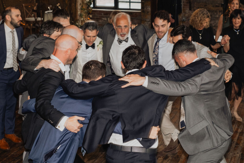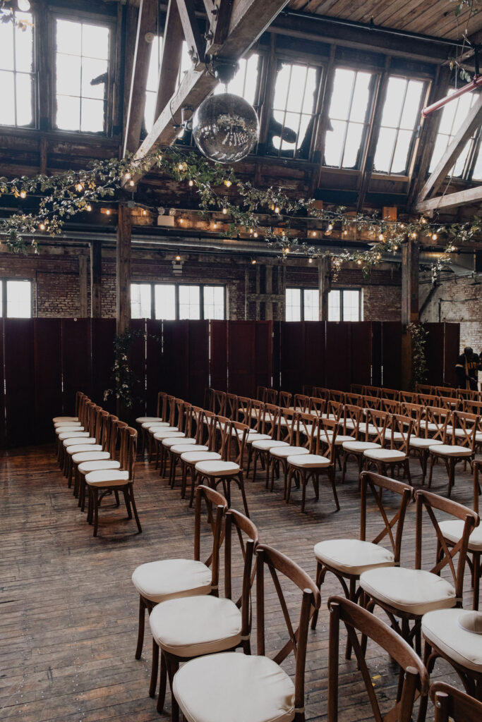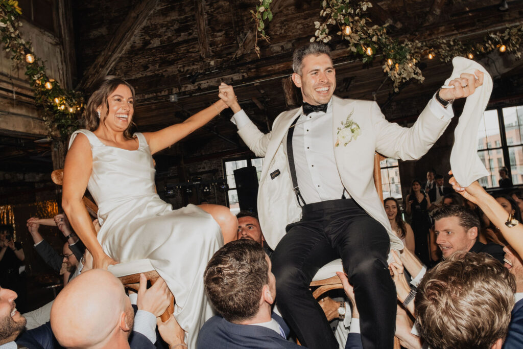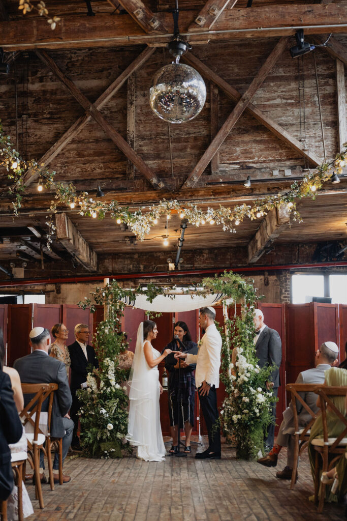 The ceremony took place inside Greenpoint Loft beneath a beautifully designed chuppah. From there, organic greenery and white florals framed the space, effortlessly complementing the venue’s raw textures. Meanwhile, the couple shared a deeply meaningful Jewish ceremony, beginning with the ketubah signing and ultimately leading into the chuppah ceremony, all while surrounded by their closest family and friends.