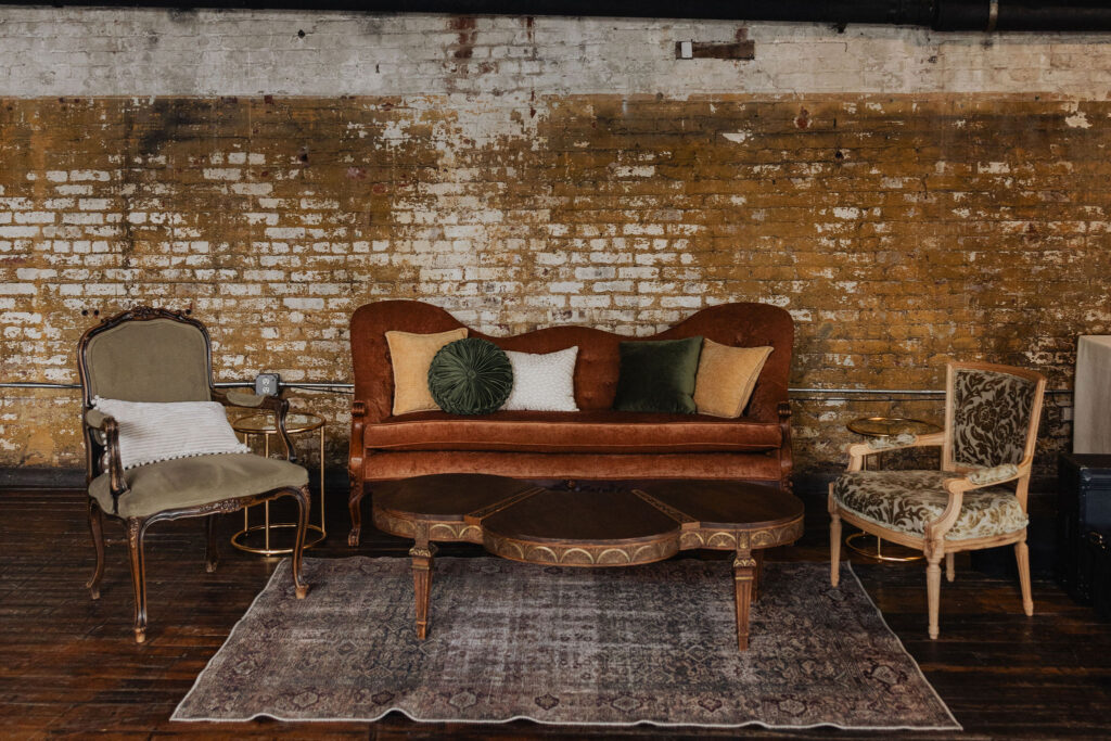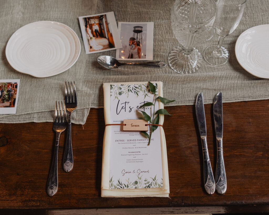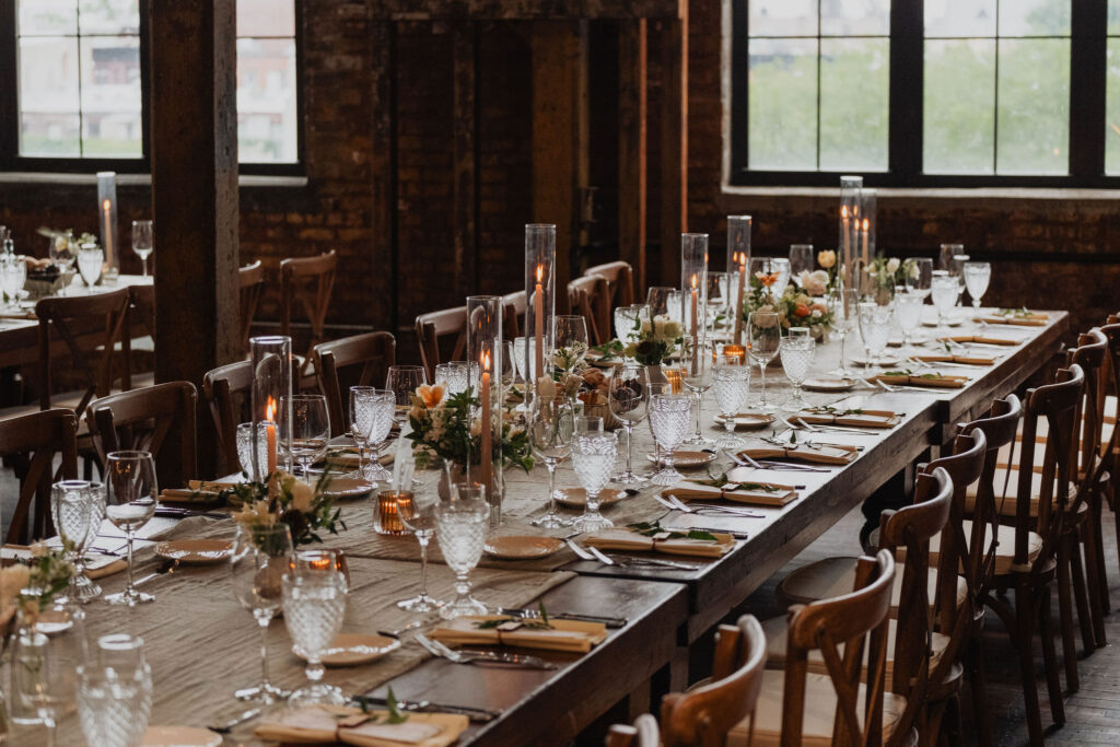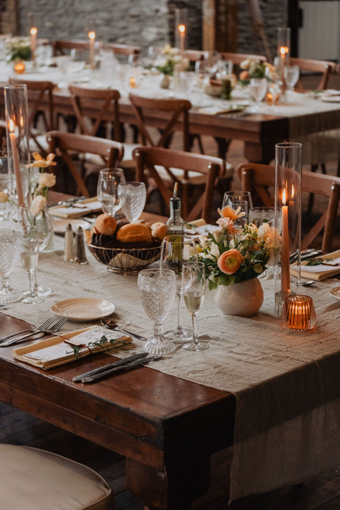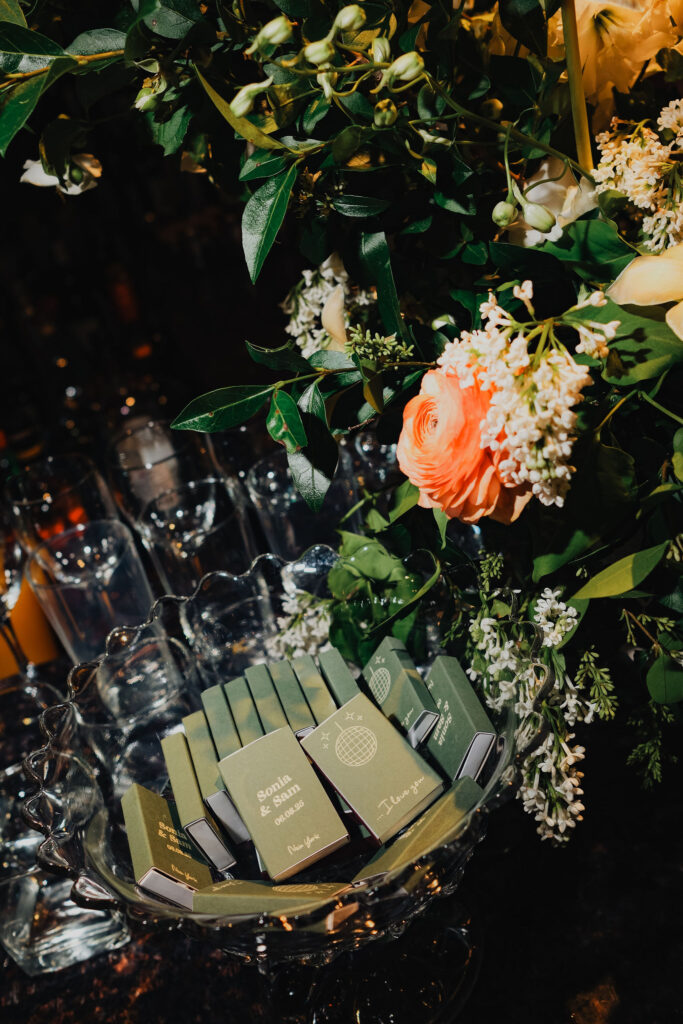 As the evening continued, the reception space gradually revealed a warm, intentional design. Along the tables, sage green runners were paired with simple orange florals and glowing candlelight, creating an elevated yet understated feel. Meanwhile, lounge seating areas surrounded the venue, offering comfort throughout the night. Between dances, guests relaxed, connected, and truly enjoyed the space. Finally, personal details made the celebration feel intimate—custom matchbooks and Polaroid photos of the couple reflected their story and added charm throughout the venue.